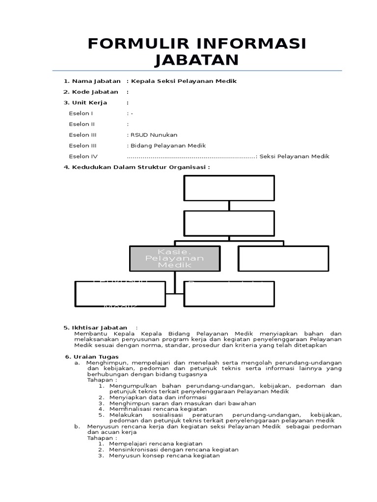 Contoh analisis jabatan kepala seksi. Contoh analisis jabatan direktur standardisasi dan kompetensi jabatan by prastyoyoyo. Ringkasan tugas memimpin sub bagian program dan evaluasi dalam pelaksanaan urusan penyusunan program kerja tahunan jangka menengah dan jangka panjang penelitian pengkajian pengembangan data informasi pemantauan evaluasi dan pelaporan kegiatan pelaksanaan administrasi kependudukan dan pencatatan sipil sesuai dengan peraturan perundang undangan untuk mendukung kelancaran tugas pokok. 102012 rsud sultan syarif muhamad alkadrie 10301 dinas pekerjaan umum dan penataan ruang informasi jabatan kepala dinas kesehatan kota pontianak. Undangan diskusi melalui webinar tgl 18 maret 2020. Abk analisis monitoring evaluasi dan pelaporan. Analisis jabatan pengertian makalah metode contoh pentingnnya analisis jabatan adalah kegiatan untuk menciptakan landasan atau pedoman bagi penerimaan dan penempatan karyawan.