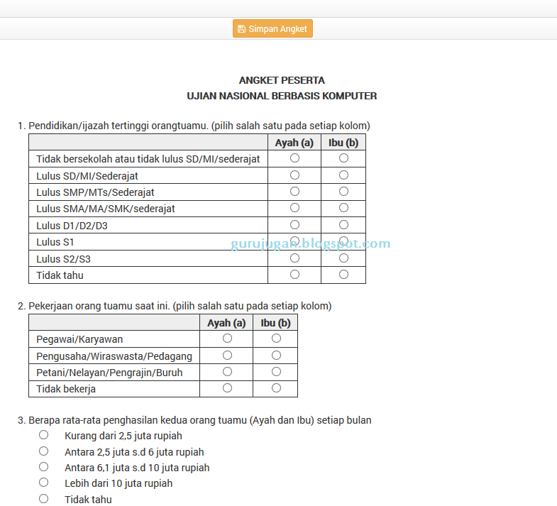 Penelitian ini bertujuan untuk menggambarkan sejarah pendidikan alumni siswa di universitas di mana alumni siswa pergi setelah menyelesaikan studi mereka dan apa yang mereka lakukan sekarang. Guru merupakan salah satu motivator bagi siswa dalam memotivasi belajar siswa. Contoh angket penelitian yang ditampilkan dalam makalah ini adalah dari studi pelacak untuk mendeteksi alumni mahasiswa jurusan di sebuah perguruan tinggi di indonesia. Angket adalah instrumen untuk jenis penelitian kuantitatif. Contoh angket atau kuesioner terbaru sebelum kita membahas jauh tentang kuesioner ini marilah kita bahas terlebih dahulu apa pengertian angket sehingga kita dapat menyamakan persepsi kemudian kita akan melanjutkan apa kegunaan fungsi dari angket kuesioner.