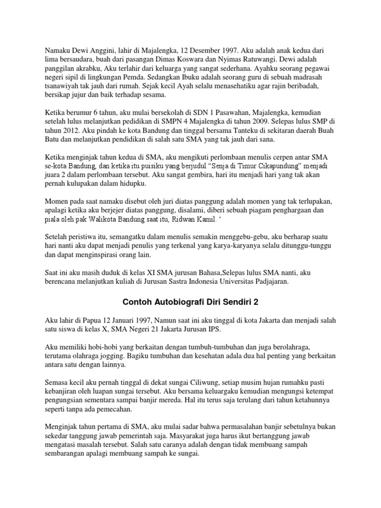 Terlahir dari pasangan suami istri yang bernama andi sudrajat dan lilis lesmana merupakan penduduk asli bumi pasundan. Contoh autobiografi panjang. Contoh kenangan yang paling saya ingat adalah ketika saya ulang tahun yang ke 16 sahabat sahabat saya dan teman satu kelas lainnya kompak mengerjai saya dengan tidak menegur saya saya tidak mau jadi orang yang terlalu percaya diri dengan berfikir saya sedang di kerjai oleh mereka semua sampai saat istirahat saya menangis karena dari pagi saya datang sampai istirahat saya tidak ada yang. Saya lahir di bandung 14 mei 1994. Saya lahir di sebuah kampung kecil yang bernama meranti bunting pada tanggal 20 oktober 1997. Dari yang paling sulit hingga mencapai keberhasilan atau prestasi yang dicapainya semasa hidupnya.