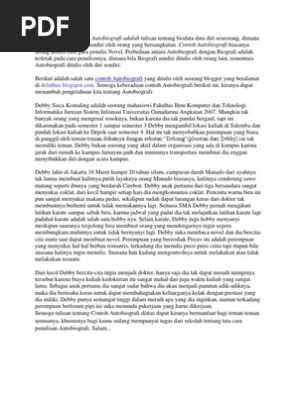 Contoh biografi diri sendiri biografi merupakan tulisan tentang perjalanan hidup atau riwayat hidup seseorang yang dapat ditulis dalam beberapa baris kalimat saja atau sampai menjadi sebuah buku. Teks biografi ditulis oleh orang lain. Jadi autobiografi merupakan biografi yang ditulis sendiri oleh yang bersangkutan. Contoh autobiografi diri sendiri singkat dan panjang. Autobiografi hampir sama dengan biografi. Dalam penulisannya teks ini menggunakan sudut pandang.