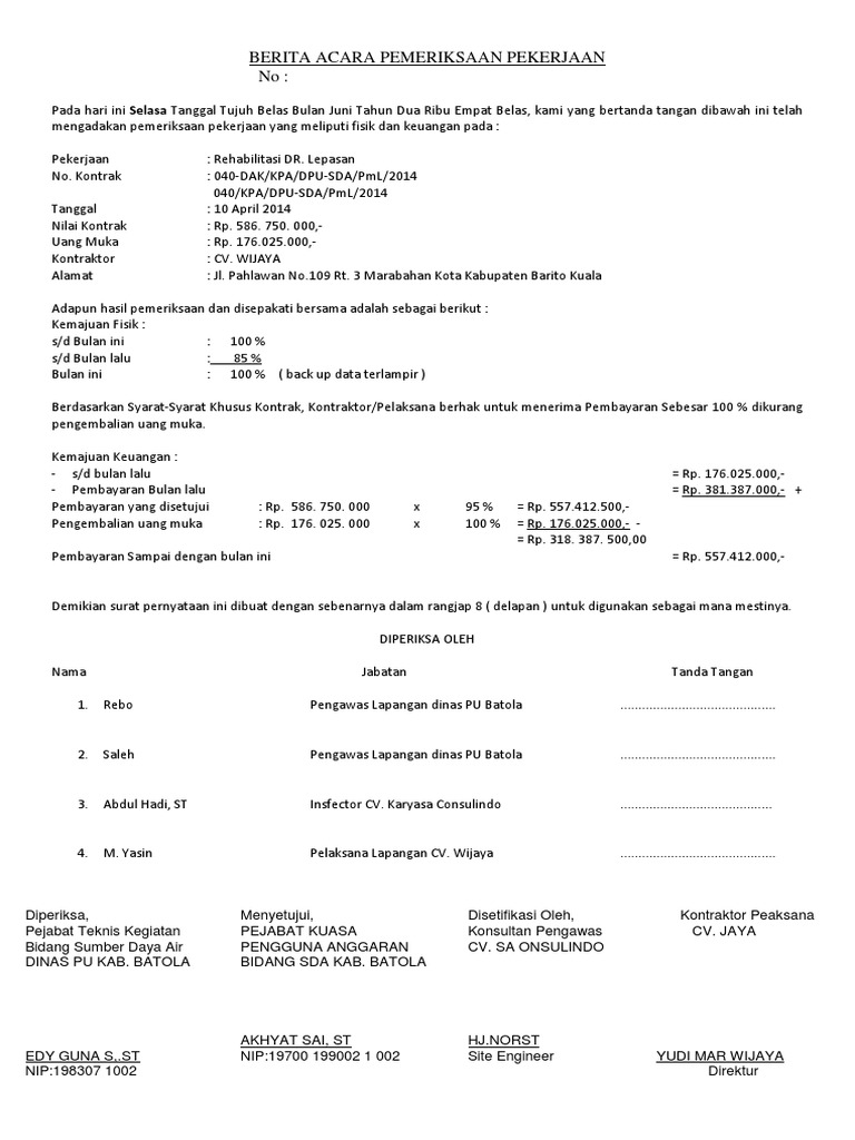 Contoh berita acara pemeriksaan lapangan. Berita acara pembayaran c. Berkas data keuangan a. Segera melaksanakan pemadatan telpord batu padas batu gunung dan lpa klas a 3. Telah bersama sama melakukan mengadakan pemeriksaan trial mix compaction. Mempercepat jadwal pengecoran 5. Berita acara kemajuan pekerjaan b.