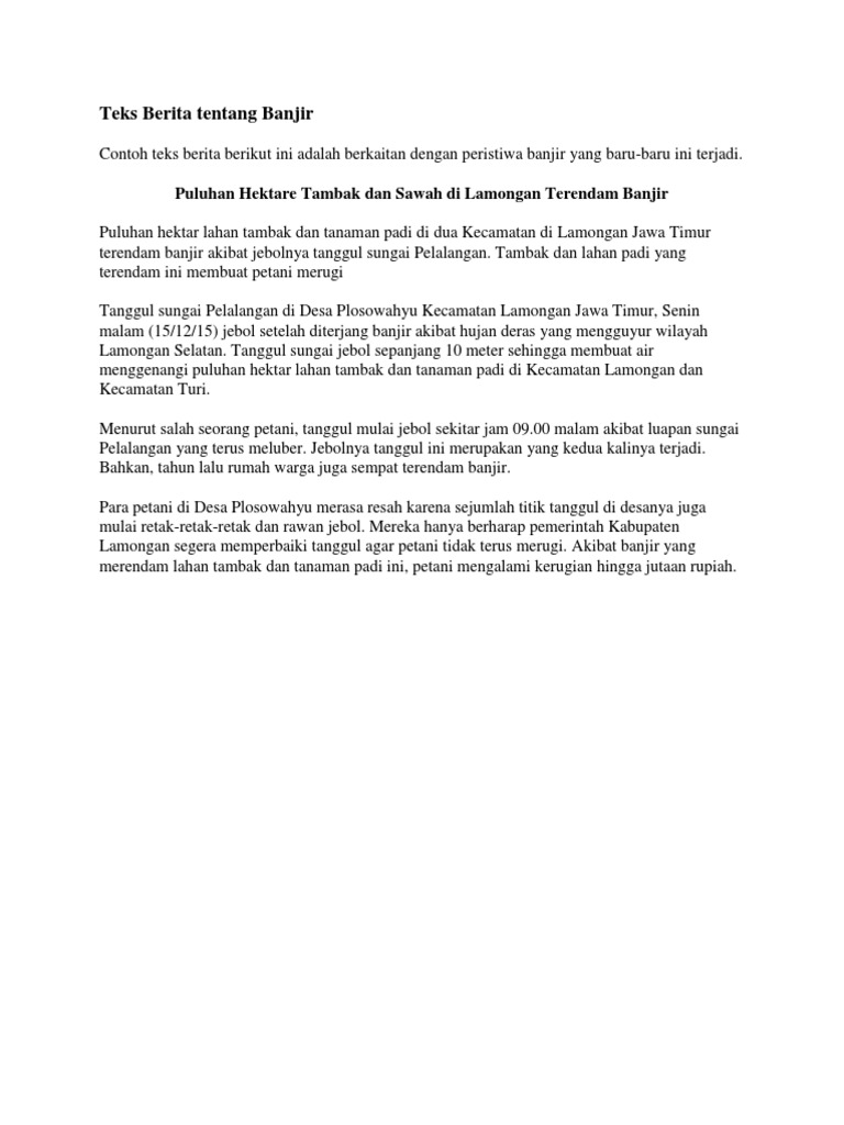 Nah berikut ini ada beberapa contoh dari teks berita dengan berbagai tema sehingga bisa memberikan sebuah gambaran mengenai seperti apa teks berita sebenarnya. Contoh teks berita singkat tentang banjir. Gemencheh 19 mei 2009. Banjir masih menggenangi hampir semua titik di pacitan jawa timur. 2 desa terenda dan banyak keluarga yang mengungsi di kampung sebelah. Sebagai wartawan kamu telah diminta untuk menulis berita tentang kejadian banjir kilat di daerah kamu.