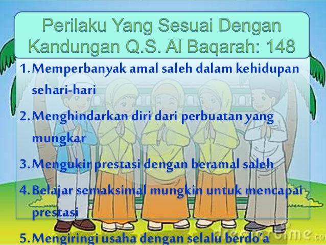 23 berkompetisi dalam kebaikan sesuai perintah allah swt dalam surat al baqarah148 dan surat al fathir. Meyakini bahwa hidup itu perjuangan dan di dalam perjuangan ada kompetisi. Melakukan persaingan dalam melakukan kebaikan sesuai dengan situasi dan kondisi. Dalam berkolaborasi semuanya diniatkan ibadah semata mata mengharap riḍa allah swt. Berkompetisi dalam kebaikan sesuai perintah allah swt dalam surat al baqarah148 dan hadist nabi berlomba dalam menggapai dunia bukan hal yang asing lagi di tengah kita untuk masuk perguruan tinggi terkemuka kita dapat menyaksikan sendiri bagaimana setiap orang ingin dapat yang terdepan. Berikut firman allah dalam surat al maidah ayat 48 dan surat al baqarah ayat 148.