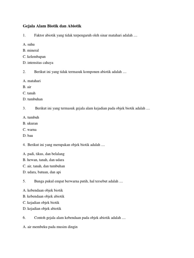 Contoh biotik dan abiotik. Contoh komponen abiotik diantaranya yaitu cahaya matahari tanah topografi iklim air dan udara. 9 contoh komponen biotik dan abiotik serta penjelasannya faktor abiotik adalah komponen fisik dan kimia tak hidup dari ekosistem sedangkan faktor biotik adalah komponen hidup dari ekosistem. Dalam ekologi lingkungan biotik dan abiotik membentuk ekosistem. Semua komponen yang tidak hidup di suatu ekosistem dan berpengaruh terhadap kehidupan makhluk hidup termasuk kondisi di atmosfer dan sumber daya air dapat disebut sebagai komponen abiotik termasuk faktor fisika dan kimia yang ada di atmosfer substrat kejernihan air energi matahari pasang surut. Serta kemudian apabila cacing tanah tersebut mati maka kemudian akan terurai dan akan menjadi bahan organik atau pun zat hara atau juga semacam oksigen karbon dll. Nah demikianlah 10 contoh gejala alam biotik dan abiotik yang dapat kita jumpai di kehidupan dan lingkungan sekitar kita.