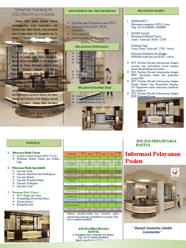 Contoh brosur rumah sakit. Inilah 40 desain brosur medis kesehatan klinik dan rumah sakit untuk yang sedang mencari contoh contoh desain brosur untuk keperluan publikasi dan marketing instansi kesehatan. Contoh berita konflik sosial. Contoh berita acara hasil evaluasi penawaran. Kalau contoh brosur dalam bahasa inggris yang satu ini merupakan brosur untuk produk restoran pizza. Pendaftaran lewat sms hanya bisa dilakukan satu hari sebelum berobat termasuk hari libur nasional pada pukul 0700 sd 1500. Masalah yang sering timbul dari pembuatan brosur rumah sakit adalah gaya komunikasi yang kurang bisa dimengerti oleh masyarakat luas karena banyak istilah medis yang termuat dalam brosur tersebut.