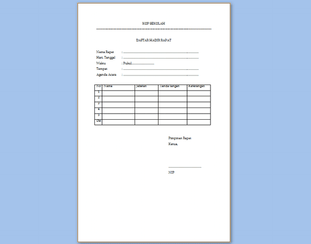 Form daftar hadir nya ada yang berformat excel ada pula yang menggunakan format microsoft word oke anda. Sebagai bukti fisik dalam dokumentasi akreditasi sekolah tahun pelajaran 20192020 diantaranya adalah tentang visi misi dan tujuan sekolah. Jadi form daftar hadir nya simple saja. Absensi daftar hadir rapat di perusahaan biasanya terdapat kolom jabatan. Unduh sebagai doc pdf txt atau baca online dari scribd. Daftar hadir peserta rapat.