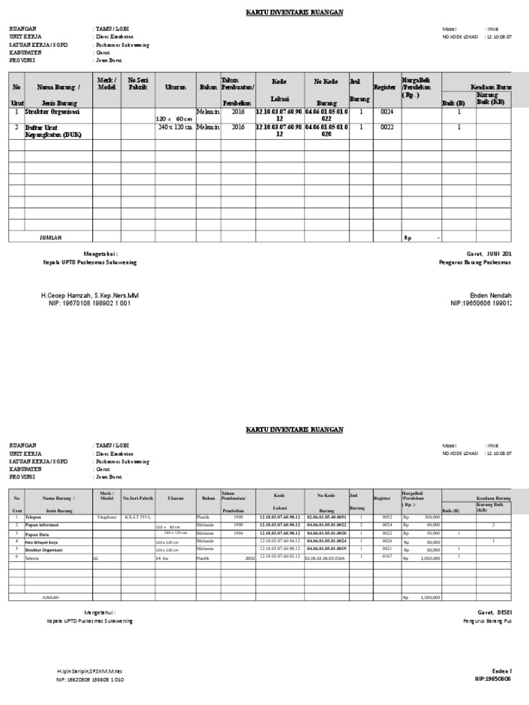 1 rangkap diletakkan di kantor dan lainnya di luar kantor. Contoh daftar inventaris peralatan kantor format kartu inventaris barang sekolah terbaru pendataan barang pembukuan sederhana pengertian jenis dan cara membuat buku inventarisasi perpustakaan sekolah sekolah dasar negeri 125543. Gunakan templat untuk melacak inventaris pribadi rumah peralatan produk dan aset dengan mudah. Anda dapat melihat preview sebelum mendownload guna menghindari kesalahan pemilihan file. Laporan daftar inventaris kantor pengadilan tata usaha negara makassar dapat dilihat pada link dibawah ini. Dalam 1 file ini terdapat laporan kib a kib b kib c kib d kib e dan kartu inventaris per ruangan serta rekapitulasi barang secara keseluruhan.
