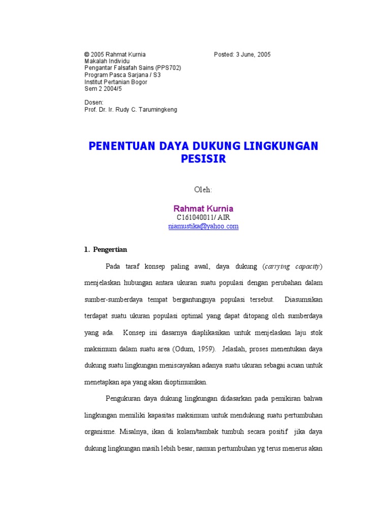 Contoh daya dukung lingkungan. Daya dukung disini maksudnya adalah kemampuan dari lingkungan itu sendiri untuk mencukupi kebutuhan dan berperan penting dalam membantu manusia untuk memenuhi kebutuhan. Dalam kehidupan dan aktivitas manusia sehari hari lahan merupakan bagian dari lingkungan sebagai sumberdaya alam yang mempunyai peranan sangat penting untuk berbagai kepentingan bagi manusialahan dimanfaatkan antara lain untuk pemukiman pertanian peternakan pertambangan jalan dan tempat bangunan fasilitas sosial ekonomi dan sebagainya. Lingkungan hidup dan cara pelestariannya. Pemerintah saat ini terus menggalakkan dan meningkatkan produksi sandang pangan dan papan. Daya dukung dan daya tampung lingkungan hidup d3tlh berbasis jasa ekosistem memperhatikan keragaman dan karakteristik fungsi ekologis kepadatan penduduk sebaran potensi sda kearifan lokal dan aspirasi masyarakat serta perubahan iklim akan menghasilkan indikasi potensi sumberdaya alam di daerah yang akan bermanfaat sebagai. Lingkungan merupakan tempat dimana kita tinggal dan berpijak.