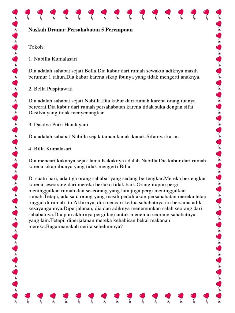 Contoh drama tentang persahabatan. Kumpulan contoh naskah drama pendek atau singkat tentang komedi persahabatan percintaan yang lucu menarik gokil tidak membosankan panjang yang dimainkan 4 5. Tentang belajar tema. Contoh naskah drama drama persahabatan teater panjang komedi singkat dll hallo sahabat pembaca yang budiman pada kesempatan yang berbahagia kali ini kita akan membahas makalah tentang beberapa macam contoh naskah dramabagi teman teman yang suka dengan sastra pasti sudah tidak asing lagi dengan masalah drama ini. Contoh drama persahabatan aneka tema dan peristiwa bisa dijadikan sebuah drama. Contoh naskah drama 5 orang belajar dan mencontek judul. Sebelum kita ke contoh teks drama.
