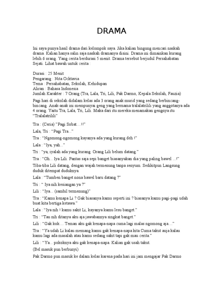Jadi kata drama dapat diartikan sebagai perbuatan atau tindakan. Contoh naskah drama teater 6 orang tentang persahabatan di sekolah karena sahabat dalam kehidupan remaja sering ada pertikaian. Rara dan munir pun akhirnya berpikir dalam usai mendengar penjelasan intan.