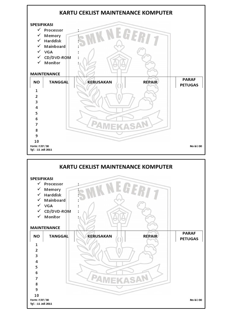 Contoh form checklist maintenance komputer. Adapun contoh checklist kebersihan rumah sakit bisa anda lihat di bawah. Contoh checklist audit no item audit item evaluasi catatan auditor. Jika anda seorang teknisi checklist ini memberitahu klien bahwa anda profesional secara menyeluruh. Yang dimaksud referensi disini adalah sebagai langkah batu loncatan apa yang harus kitah lakukan pada komputer kita enegan melihat catatanisian pada tabel yang berisi apa saja yang terlah kiyta lakukan pada pc. Checklist for computer maintenance 1 of 3 as system administration. Pengertian check sheet lembar periksa dan cara membuatnya check sheet merupakan salah satu tools di qc 7 tools 7 alat pengendalian kualitas yang paling sederhana dan sering digunakan sebagai tools pertama dalam pengumpulan dalam sebelum digunakan untuk disajikan dalam bentuk grafik.