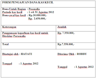 Dibulan terakhir pemakaian dana kas kecil untuk biaya listrik dan air minum rp 6870000 biaya supllies kantor rp 3540000 dan selanjutnya untuk perjalanan dinas rp 11000000. Misalnya mycom computer pada tanggal 1 desember 2015 menentukan dana petty cash sebesar rp 10000000. Setelah dana kas kecil habishampir habis kasir membentuk kembali dana kas kecil mengisinya sebesar jumlah nominal pengeluaran yang terjadi. Tiga saudara pada tanggal 03 agustus membentuk kas kecil pengisian kembali kas kecil dilakukan setiap akhir bulan. Administrasi periode kas kecil. Formulir pengajuan dana kas kecil ini hanya digunakan pada sistem imprest yaitu pada pembukuan kas kecil sistem dana tetap sedangkan pada sistem fluktuatif tidak menggunakan formulir pengajuan dana kas kecil.