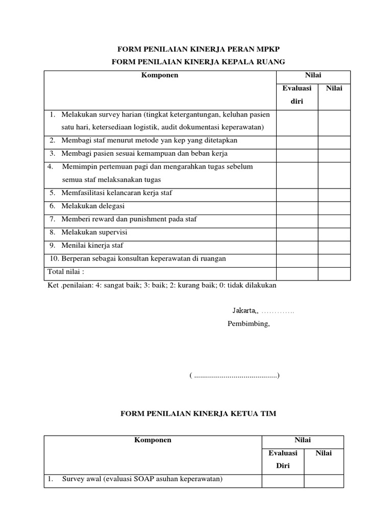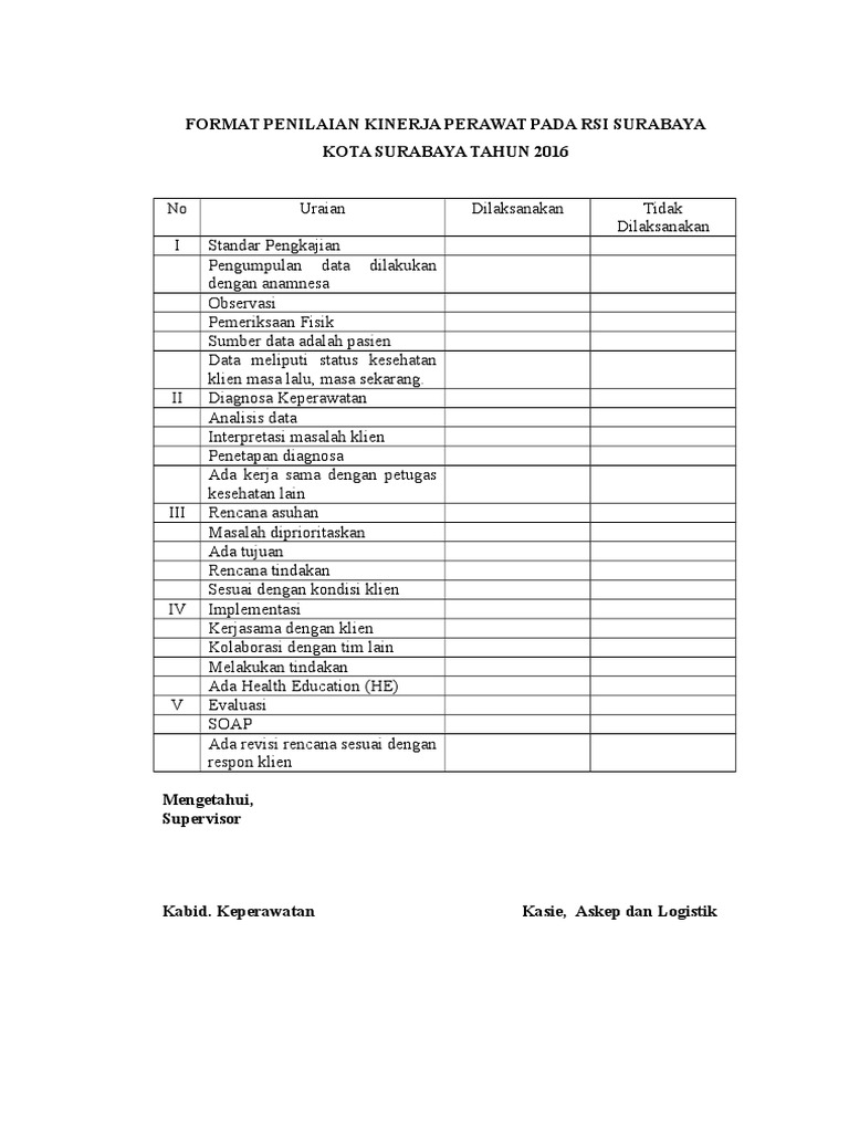 Contoh format penilaian kinerja perawat. Elemen perilaku atau kecakapan dan elemen hasil kerja. Format penilaian kinerja perawat. Metode penilaian rating scale skala rating versi werther dan davis metode penilaian kinerja karyawan rating scale ini merupakan penilaian yang tertua. Penilaian kinerja merupakan alat yang paling dapat dipercaya oleh manajer perawat dalam mengontrol sumber daya manusia dan produktivitas swanburg1987. Save save penilaian kinerja perawat contohpdf for later. Penilaian kinerja merupakan alat yang paling dapat dipercaya oleh manajer perawat dalam mengontrol sumber daya manusia dan produktivitas swanburg1987.