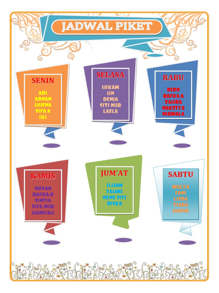 Home contoh 1310 contoh gambar. Berikut ini saya poskan contoh desain untuk jadwal regu piket dan struktur organisasi kelas yang biasa dipasang di. Contoh desain jadwal pelajaran super. Hasil sederhananya seperti gambar dibwah ini. Disini kita akan membuat jadwal piket menggunakan microsoft word cara ini saya rasa cukup mudah sekali karna di ms word sudah ada yang kumpulan shapes yang mana salah satunya bisa kita gunakan untuk membuat jadwal keren dan unik. Contoh gambar jadwal piket kelas yang unik.