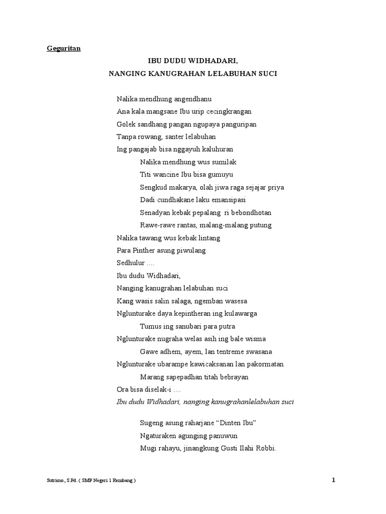 Contoh geguritan bahasa jawa. Geguritan mempunyai banyak kategori seperti bentuk lagu yang bisa dinyanyikan dan kedua seperti sebuah puisi. Geguritan berkembang dari tembang jawa yaitu liriksajak yang mempunyai irama nada dalam bahasa indonesia disebut lagu. Puisi bahasa jawa puisi bahasa jawa biasa disebut dengan geguritan adalah bentuk puisi yang berkembang di kalangan masyarakat penutur bahasa jawa dan bali. Contoh geguritan bahasa jawa dengan berbagai tema. Banyak sekali orang yang menyukai segala sesuatu yang berhubungan dengan puisi baik membuat puisi ataupun membaca puisi. Jadi bisa dibilang geguritan jawa modern sama saja dengan seni puisi modern hanya saja ditulis menggunakan bahasa jawa.