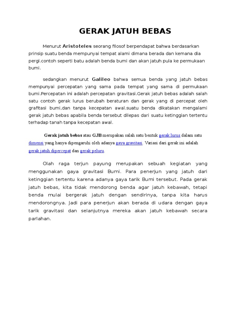 Contoh gerak jatuh bebas. Buah kelapa terlepas dari tangkainya dan tiba di tanah setelah tiga detik. Karena gerak jatuh bebas merupakan gerak lurus berubah beraturan maka semua persamaan yang kita peroleh ketika membahas gerak lurus berubah beraturan berlaku pada gerak jatuh bebas. Gerak benda hanya dipengaruhi oleh gaya gravitasi gaya tarik menarik bumi sehingga benda bergerak dengan percepatan sama dengan percepatan gravitasi bumi g 10 ms2. Contoh gerak jatuh bebas adalah buah kelapa yang jatuh dari pohonnya atau suatu benda yang jatuh dari ketinggian tetapi pada saat jatuh tidak didorong oleh gaya jatuh dengan sendirinya. Ketika jatuh bebas buah. Gerak jatuh bebas atau biasa disebut gjb adalah sebuah gerak benda yang jatuh dari suatu ketinggian tanpa adanya kecepatan awal.