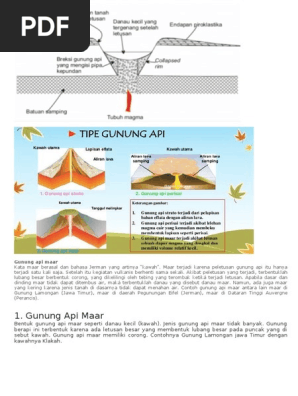 Contoh gunung api maar. Lava ini kemudian mengisi lubang kawah di bagian puncak gunung. Gunung api campuran composite volcano gunungapi ini terbentuk dari kombinasi aliran lava dan material piroklastika pada letusan eksplosif. Gunung api maar yaitu gunung api yang lubang kepundan berbentuk corong. F gunung api maar gunung api ini terbentuk dari adanya ledakan atau letusan yang bersifat eksplosif dan biasanya cenderung terjadi sekali dengan kekuatan yang cukup hebat. Gunung api di dunia terutama di indonesia dibedakan menjadi 3 jenis tergantung pada bentuk dan penyebab terbentuknya gunung tersebut yaitu gunung api perisai gunung api strato dan gunung api maar. Terbentuk akibat letusan besar pada ujung puncak gunung yang kemudian membentuk lubang besar yang diberi nama.
