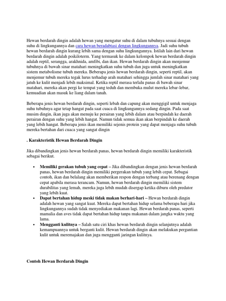 Hewan berdarah dingin adalah organisme di mana sumber panas fisiologis internal yang relatif kecil atau sangat penting diabaikan dalam mengendalikan suhu tubuh. Hewan hewan tersebut dapat bertahan pada suhu yang sangat dingin maupun panas. 30 contoh hewan berdarah panas homoiterm hewan berdarah panas juga disebut homoiterm. Arachnida merupakan hewan invertebrata yang termasuk hewan berdarah dingin. Contoh hewan berdarah panas adalah. Poikiloterm hewan berdarah dingin referensi artikel bertopik hewan ini adalah sebuah rintisan.