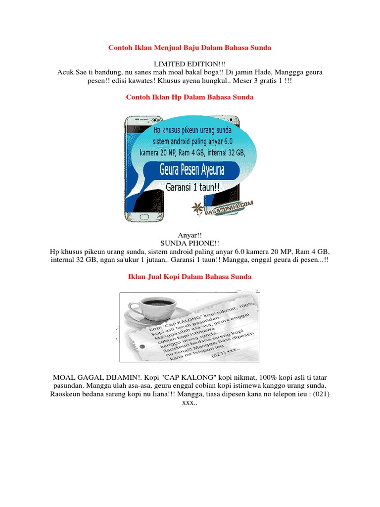 Contoh iklan bahasa sunda lengkap dengan caption teks kata kata kalimat gambar desain poster baik komersil maupun non komersil.
