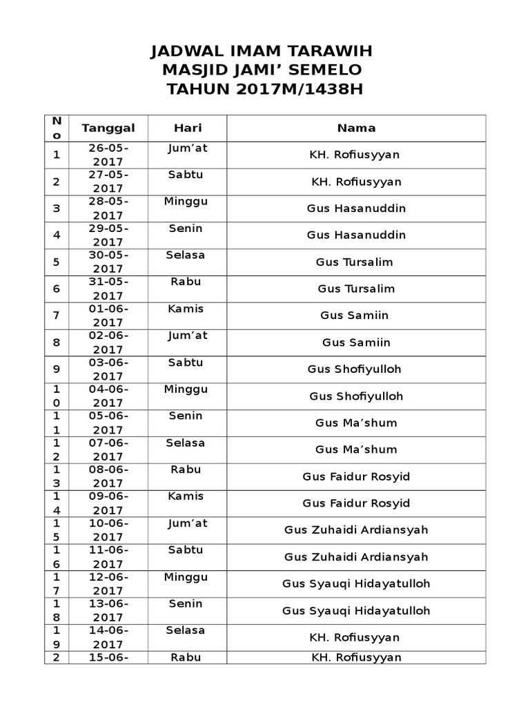 Adapun jadwal imam dan kultum shalat tarawih adalah sebagaimana terlampir. Ayi syaiful h sdr. I m a m. Untuk menjadi imam dan kultum sholat tarawih di masjid nurjannah. Shubuh di masjid saksi dipimpin imam masjid istiqlal jakarta. Home ramadhan jadwal imam sholat tarawih jadwal imam sholat tarawih 2 comments tamir masjid nurul huda dusun siwalan desa siwalanrejo sukodadi lamongan.