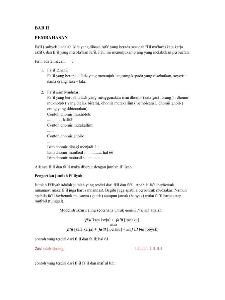 Contoh jumlah fi liyah. Susunan ini adalah susunan jumlah filiyah dengan jaa sebagai fiilnya dan dhamir tersimpan sebagai failnya. Itulah tadi penjelasan tentang jumlah ismiyah kalimat yang diawali dengan kata benda dan jumlah filiyah kalimat yang diawali dengan kata kerja. Jumlah filiyah adalah jumlah yang diawali dengan kalimah fiil. Contoh kalimat ismiyah dan kalimat filiyah beserta artinya. Selamat belajaaar semoga bermanfaat. Failsubyek adalah isim yang terletak setelah fiil malum kata kerja aktif dan berfungsi sebagai pelaku kata kerja tersebut.