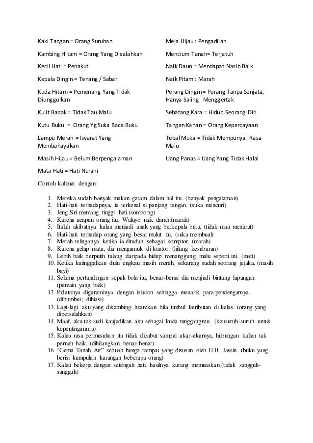 Ungkapan idiom pengertian menurut para ahli jenis dan contoh untuk pembahasan kali ini kami akan mengulas mengenai ungkapan idiom yang dimana dalam hal ini meliputi pengertian menurut para pos pos terbaru. Ungkapan biasanya digunakan untuk menyatakan situasi tertentu dalam bentuk kiasnya. Dapat disimpulkan bahwa ungkapan kaki tangan bisa diartikan sebagai orang kepercayaan anak buah atau orang suruhan. Dalam contoh kalimat ungkapan kali ini kita khusus memberikan contoh ungkapan tangan kanan. Semoga contoh kalimat konotasi dan denotasi bahasa indonesia ini nantinya dapat bermanfaat bagi anda. Itulah 40 contoh kalimat pada ungkapan atau istilah kaki tangan yang dilansir dari berbagai sumber.