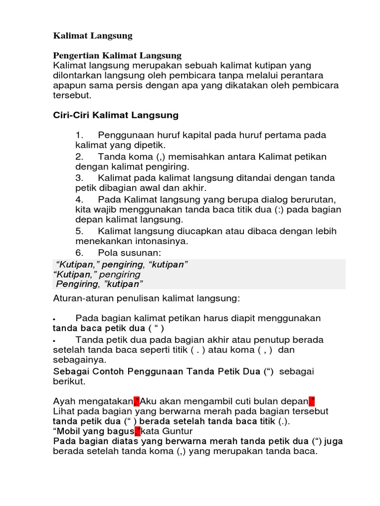 Kalimat langsung dan kalimat tidak langsung tentu memiliki ciri ciri hingga kaidah penulisannya masing masing. Bagian ujaranucapan diberi tanda petik dapat berupa kalimat perintah berita atau kalimat tanya. Kalimat hasil kutipan pembicaaraan seseorang persis seperti apa yang dikatakannya. Kalimat langsung maupun kalimat tidak langsung mungkin adalah salah satu pelajaran yang sering kamu temui ketika sedang bersekolah baik di sd smp maupun pada saat sma. Dalam menulis kalimat langsung ada beberapa hal yang harus kamu perhatikan terutama dalam penggunaan tanda baca. Ciri ciri kalimat langsung bertanda kutip dalam bahasa tertulis.