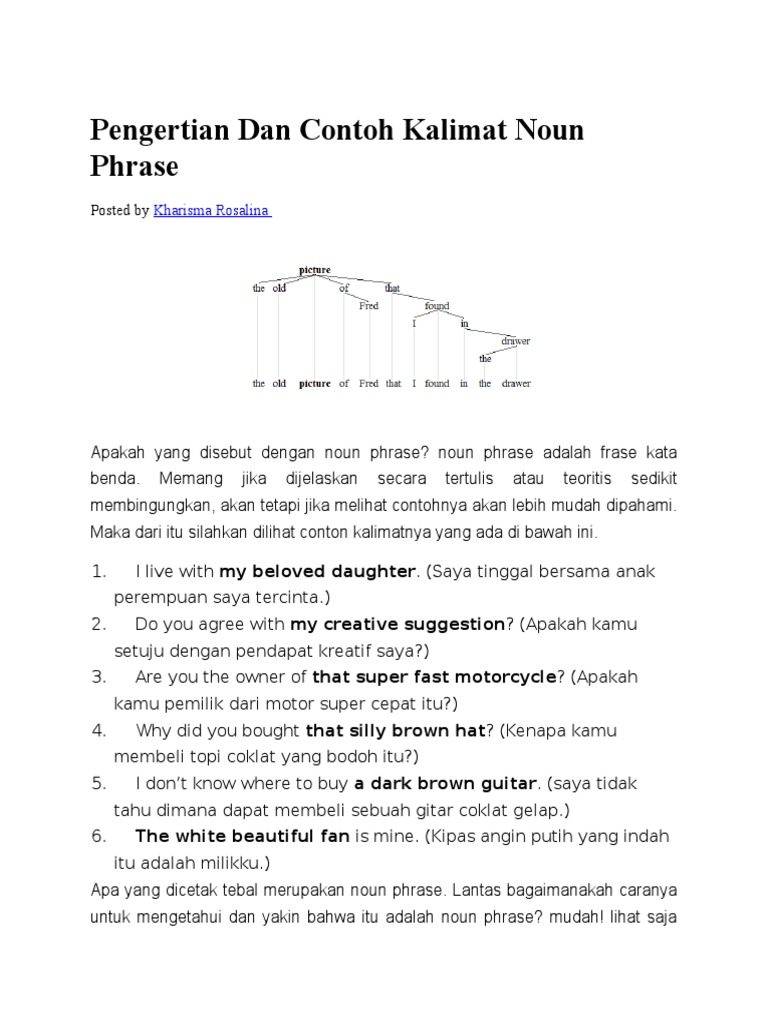 Contoh kalimat noun phrase. Yang harus kamu lakukan sekarang adalah ke halaman selanjutnya basic noun phrase keterangan. No contoh kalimat noun phrase. Central determiner possessive my head noun bag 2. Verb phrase disebut juga dengan frasa kata kerja. Rumah ini sangatlah tua my brother is a football player. Sebagai subjek a new red car is mine.