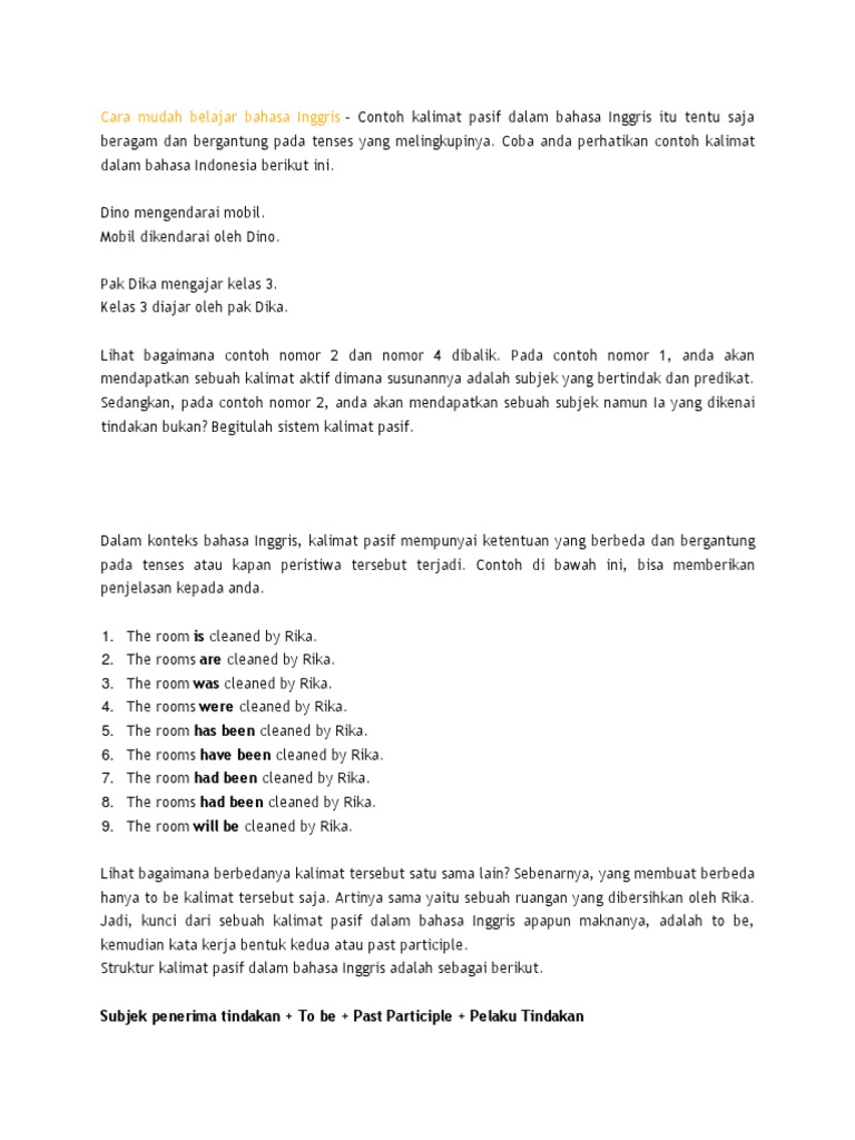 Materi belajar kalimat pasif aktif bahasa inggriscontoh kalimat sekolahbahasainggris apakah kalian kesulitan dalam merubah kalimat aktif menjadi kalimat pasif dalam bahasa inggris. Dalam bahasa inggris ada banyak sekali jenis kalimat yang perlu kita pelajari dan beberapa diantaranya adalah kalimat aktif dan juga kalimat pasif. 15 contoh kalimat pasif passive voice dalam bahasa inggris. Dengan kata lain anda bisa menggunakannya atau tidak. Dapatkan juga rahasia mengubah kalimat aktif menjadi pasif dalam bahasa inggris. Kalimat ini adalah pelajaran dasar bagi kalian yang ingin cepat memahami tense pada bahasa inggris.