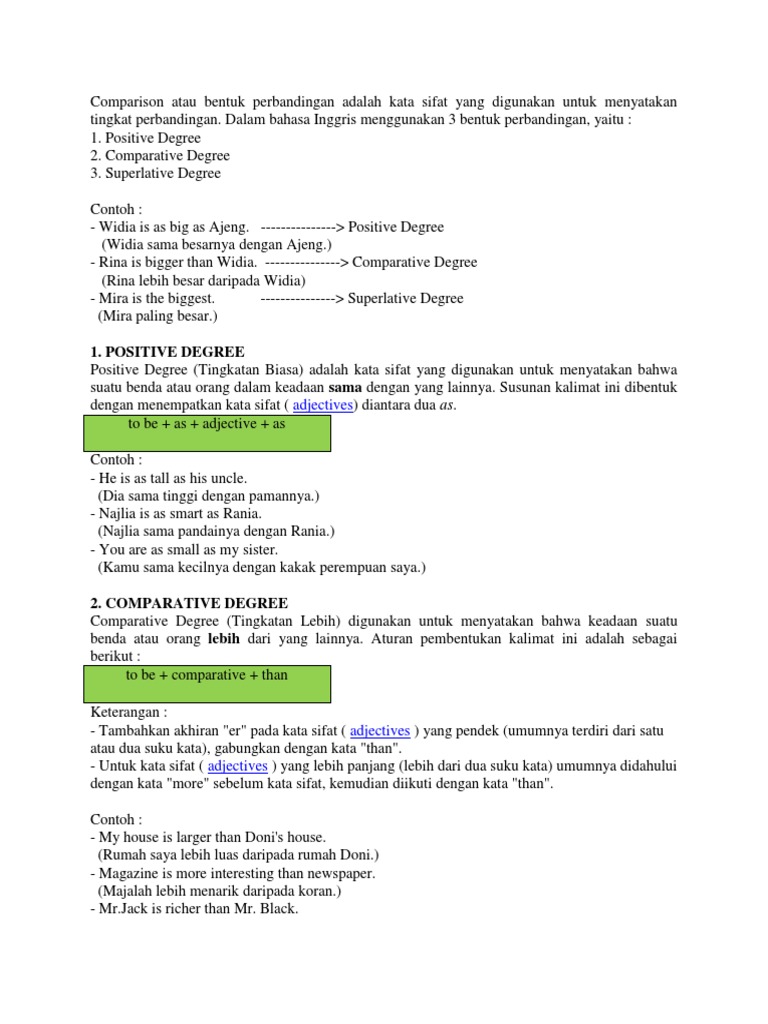 Kata sifat adjectives sering digunakan dalam bentuk perbandingan yaitu bila kita hendak membandingkan antara sifat suatu benda dengan sifat suatu benda yang lainnya. The degrees of comparison tingkat perbandingan adalah istilah dalam bahasa inggris yang merupakan tingkat tingkat perbandingan pada kata sifat.