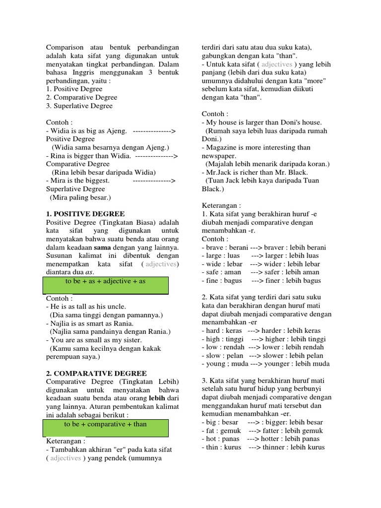 Faster slower more beautiful dll. Pada paragraf perbandingan fungsinya adalah untuk menemukan kelebihan dan kekurangan dari 2 hal yang berbeda benda kalimat maupun lainnya misalnya saja kecepatan mobil dan sepeda motor. Adapun berdasarkan tingkatannya the degrees of comparison dibagi menjadi 3 golongan1. Kalimat yang kita gunakan sehari hari maupun untuk kepentingan umum memiliki macam yang perlu kita ketahu sebagai penempatan yang baik dan benar. Adjektif dengan dua suku kata. Namun terdapat beberapa adjectiveadverb yang memeiliki bentuk irregular dalam menunjukkan unequal comparisons seperti better worse dll.