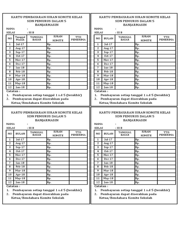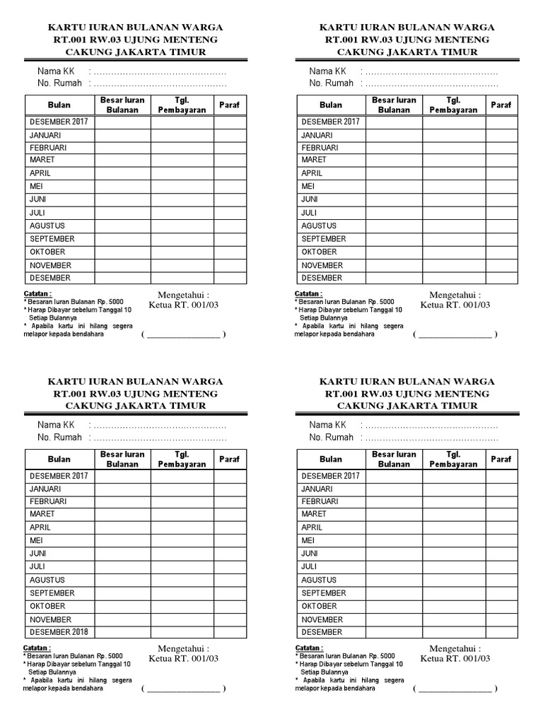 Contoh kartu iuran bulanan. Donatur tetap keamanan berbeda dengan iuran keamanan donatur tetap bersifat sumbangan sukarela yang diberikan oleh warga yang taraf hidupnya sangat mampu. Download contoh kartu spp paud pembayaran iuran anak didik paud tk kb tpa sps format document excel yang dapat di edit dengan mudah. Contoh kartu iuran bulanan siswa paud minggu april 30 2017 tambah komentar administrasi paud untuk mempermudah pembuatan kartu iuran bulanan siswa paud atau kartu catatan spp siswa kami bagikan salah satu contohnya yang bisa di edit softcopy nanti sesuai dengan logo sekolah masing masing dalam format word. Kartu iuran bulanan warga rt29. Dimana buku iuran itu ada dana wajib yakni sebesar rp 10000 dan iuran suka rela yang namanya suka rela berarti tanpa ada batas ya pak bu hehe lalu tiap kali warga membayarkan iuran jangan lupa untuk tanda tangan pada kolom warga yang sudah disediakan untuk bukti. Berikut adalah contoh gambar kartu spp syahriah bagi lembaga taman pendidikan al quran dimana dibuat berdasarkan dua tahun ajaran baru.