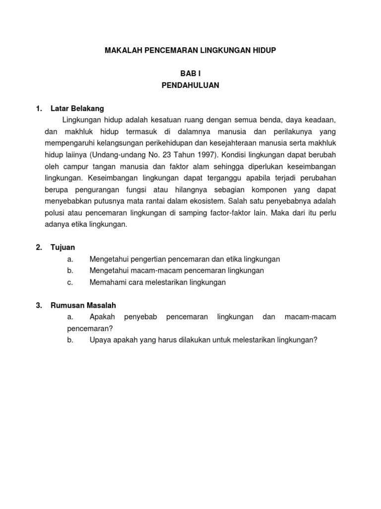 Bab 1 pendahuluan alatar belakang tingkat pencemaran lingkungan hidup masyarakat saat ini sangat tinggipencemaran merupakan masalah kita bersama yang berada dalam lingkungan tersebutpencemaran ini harus diselesaikanpencemaran lingkungan dapat berupa pencemaran udarapencemaran aliran. Contoh karya tulis ilmiah tentang lingkungan hidup. Karya tulis ilmiah tentang lingkungan hidup archiestar 9 1 kata pengantar puji syukur penulis panjatkan kehadirat tuhan yang maha esa karena berkat dan rahmat nya lah penulis dapat menyelesaikan tugas ini sebagai sebuah makalah lingkungan hidup. Contoh karya tulis ilmiah populer sederhana formal non formal tentang pendidikan sampah pergaulan bebas pencemaran air bahaya rokok narkoba kesehatan kenakalan remaja lingkungan yang baik dan benar. Sma negeri 2 rujukan kerinci. 4 tahun 1982 mendefinisikan pencemaran lingkungan atau polusi adalah masuknya atau dimasukkannya mahluk hidup zat energy dan komponen lain dalam lingkungan sehinmgga kualitas lingkungan turun sampai ke tingkat tertentu yang menyebabkan lingkungan menjadi kurang atau tidak dapat berfungsi lagi sesuai peruntukannya.