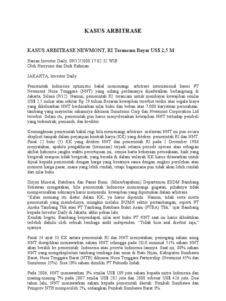 Contoh kasus arbitrase dan analisisnya pengertian arbitrase. Kehadiran investor asing untuk menanamkan modal di dalam negeri memang berdampak positif pada perekonomian indonesia. Siti asiyah 40 tahun. Sebuah negara dapat menjalankan yurisdiksi kriminal dan privat terhadap warga negaranya meskipun yang bersangkutan sedang berada di negara lain. Kali ini akan membahas mengenai arbitrase. Maka berikut contoh kasus arbitrase nasional bangsa indonesia yaitu.