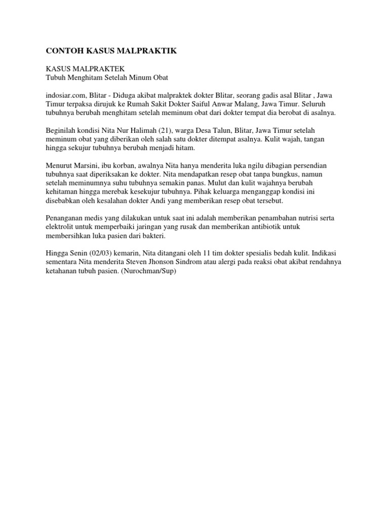 Tugas malpraktek studi kasus. Korban siska makatey warga desa tateli weru meninggal dunia saat bersalin akibat terjadinya pembesaran bilik kanan jantung. Contoh bentuk laporan qc. Sebuah negara dapat menjalankan yurisdiksi kriminal dan privat terhadap warga negaranya meskipun yang bersangkutan sedang berada di negara lain. Penyelesaian kasus malpraktek rs. Dalam kasus tersebut bidan endang telah melanggar wewenangnya sebagai seorang bidan dan melakukan malpraktik.