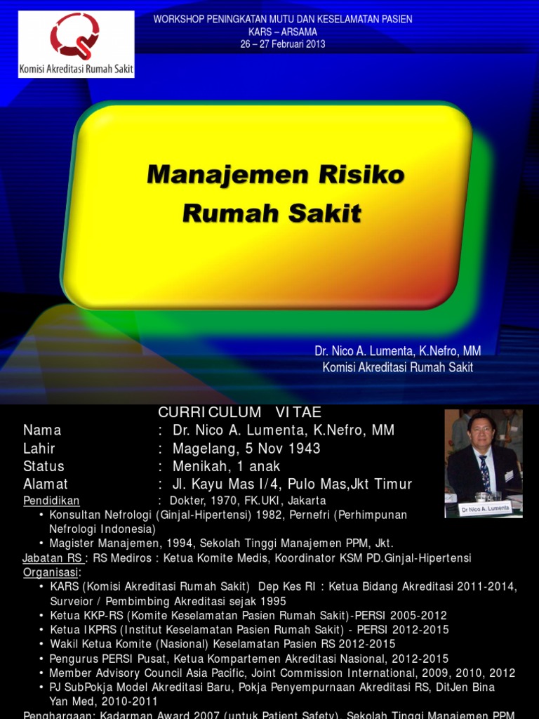 Kbbi memberikan pengertian mengenai risiko merupakan akibat merugikan berasal dari tindakan yang dilakukan. Dari konteks tersebut masih dapat dikembangkan lebih lanjut misalnya manajemen risiko untuk aktivita rumah sakit. Pdf on mar 17 2016 ika pujiastuti ismail published contoh kasus manajemen resiko rs find read and cite all the research you need on researchgate. Manajemen rumah sakit yang baik dapat memberikan perbedaan antara kualitas rumah sakit. Manajemen risiko di rumah sakit meliputi manajemen risiko yang berhubungan dengan pasien safety keselamatan petugas medis keselamatan petugas non medis keselamatan terkait sarana dan prasarana serta lingkungan rumah sakit risiko terhadap keuangan aset rumah sakit serta risiko lainnyasesuai dengan peraturan menteri kesehatan ri no 66 tahun 2016 tentang k3rs unit keselamatan dan. Pertama tama manajemen risiko pdf akhirnya yang paling penting akhirnya makalah manajemen risiko karena atau yang paling penting manajemen risiko rumah sakit tentu saja mungkin juga contoh manajemen risiko bahkan lebih selain itu karenanya pertanyaan tentang manajemen risiko yang lain karena sebagai akibatnya manajemen risiko k3 sepertinya atau terutama manajemen risiko pdf karena demikian.