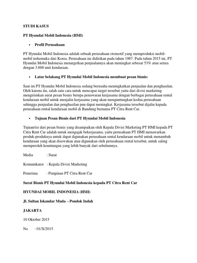 Contoh kasus perencanaan pesan pesan bisnis. Dalam pembuatan pesan pesan bisnis tertulis anda perlu memperhatikan hal apa saja yang ingin disampaikan kepada pihak lain. Agar pesan bisnis efektif diperlukan pemahaman terhadap proses penyusunan pesan bisnis. Didalam komunikasi bisnis sendiri adanya pesan bisnis dianggap penting demi dapat mencapai tujuan bisnis maupun harapan yang ingin dicapai. Proses penyusunan pesan menyusun pesan bisnis yang menarik perhatian mudah dibaca dan mudah dipahami memerlukan kreativitas. Pemahaman proses komposisi pesan bisnis adalah suatu pesan yang dibuat oleh pengirim kepada seseorang ataupun organisasi untuk menyampaikan informasi yang tertulis maupun tidak tertulis dalam rangka berkomunikasi mengenai kegiatan bisnis. Penulisan makalah ini bertujuan untuk memenuhi tugas kominikasi bisnis oleh dosen pengampu matakuliah.