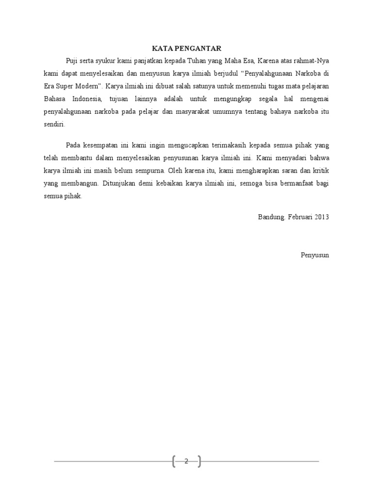 Contoh kata pengantar karya ilmiah. Karya tulis yang dimaksud meliputi buku makalah esai tesis disertasi surat kabar tabloid dll. Dalam upaya membantu para pelajar atau mahasiswa untuk penyelesaian karya tulis ilmiah berikut kami berbagi contoh kata pengantar karya tulis ilmiah untuk sekadar dijadikan panduan atau referensi dalam penyelesaian suatu karya tulis ilmiah. Kata pengantar adalah bagian dari pendahuluan dalam sebuah karya tulis yang berisi ungkapan terima kasih dari penulis. Puji syukur saya panjatkan kehadirat allah swt yang telah memberikan rahmat serta karunia nya kepada saya sehingga saya berhasil menyelesaikan karya ilmiah ini yang alhamdulillah tepat pada waktunya yang berjudul kebersihan lingkungan disekitar kita. Judul karangan ilmiah kebersihan lingkungan disekitar kita kata pengantar puji dan syukur saya panjatkan kepada allah swt yang di mana telah memberikan rahmat dan karunia nya pada saya sehingga saya dapat menyelesaikan karya ilmiah ini. Puji syukur alhamdulillah penulis panjatkan kehadirat tuhan yang maha esa karena dengan segala kuasa nyalah penulis akhirnya bisa menyusun karya tulis ilmiah yang berjudul permen putri malu solusi bagi para penderita insomnia ini sesuai dengan waktu yang telah ditentukan.
