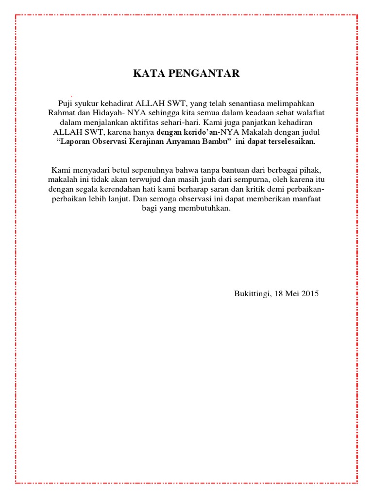 Contoh kata pengantar laporan observasi. Kompilasi karya ilmiah dan non ilmiah. Beserta tips dan cara membuat kata pengantar yang baik dan benar. Karena berkat rahmat dan karunia nyalah penulis dapat menyelesaikan laporan observasi ini sesuai waktu yang telah di tentukan. Puji dan syukur kami panjatkan kehadirat tuhan yang maha esa atas kasih dan sayang nya sehingga kami dapat melaksanakan kuliah kerja nyata kkn uin malang tahun 2014 di kelurahan dampit kecamatan dampit malang sesuai rencana dan semua program dapat terlaksana dengan lancar. Sayangnya pembuatan kata pengantar kadang kadang diremehkan dan dianggap sepele bahkan dalam penulisannya masih banyak yang dangkal. Contoh kata pengantar laporan bagi mahasiswa dan pelajar membuat kata pengantar untuk tugas laporan adalah hal yang sangat penting.