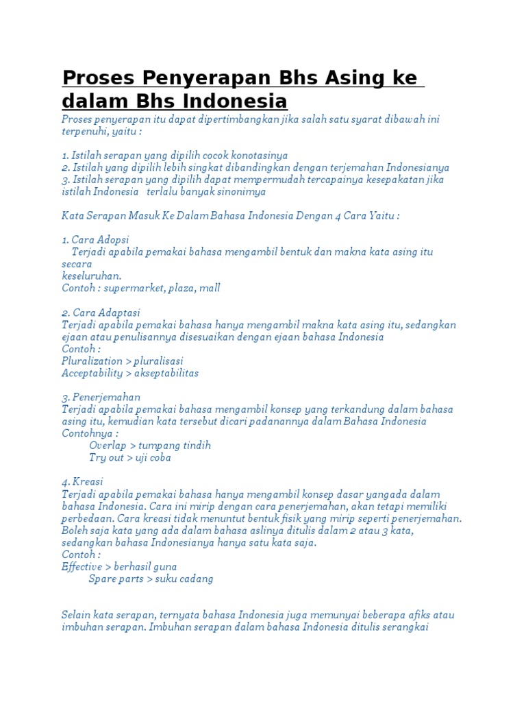 Hal ini membuat bahasa indonesia bersifat dinamis dan berkembang dalam kosa katanya. Nah apakah sahabat sbi sedang mencari contohcontoh kata apa saja sih yang merupakan kata serapan dari bahasa inggris di dalam bahasa indonesia. Kata serapan di indonesia berasal dari bahasa asing seperti inggris belanda arab india hingga china. Secara relatif diperkirakan jumlah ini antara 10 15. Kata serapan adopsi adalah proses terserapnya bahasa asing ke dalam bahasa indonesia dengan mengambil keseluruhan kata.