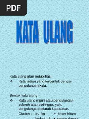 Kata ulang suku awal atau dwipurwa yaitu bentuk pengulangan suku pertama kata dasarnya biasanya disertai. Reduplikasi atas seluruh bentuk dasar bisa kata dasar maupun kata berimbuhan. Contoh kata ulang berubah bunyi atau bervariasi. Lompat lompatan bersama sama menari nari. Pengulangan dengan perubahan fonem kata ulang berubah bunyi yaitu kata ulang yang terjadi dari pengulangan bentuk dasar yang menjadi komponen pokok disertai dengan perubahan fonem baik fonem vokal maupun. Kata ulang berubah bunyi.