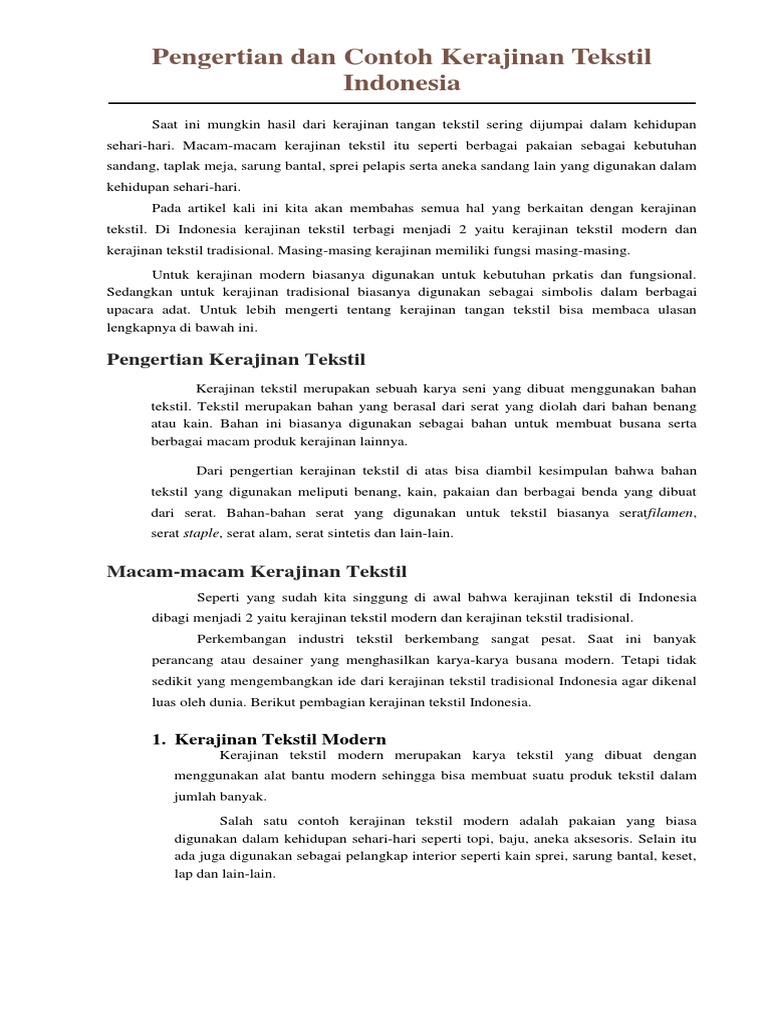 Contoh kerajinan tekstil sederhana adalah kain tenun. Sehingga dalam proses pembuatannya bisa dengan jumlah yang banyak. Fungsi kerajinan tekstil tradisional. Sebagai manusia yang beradab pakaian atau sandang adalah salah kebutuhan dasar. Pastinya jika anda mau mencoba kerajinan ini maka uang yang anda keluarkan akan sedikit berkurang. Contoh kerajinan tekstil modern ini meliputi.