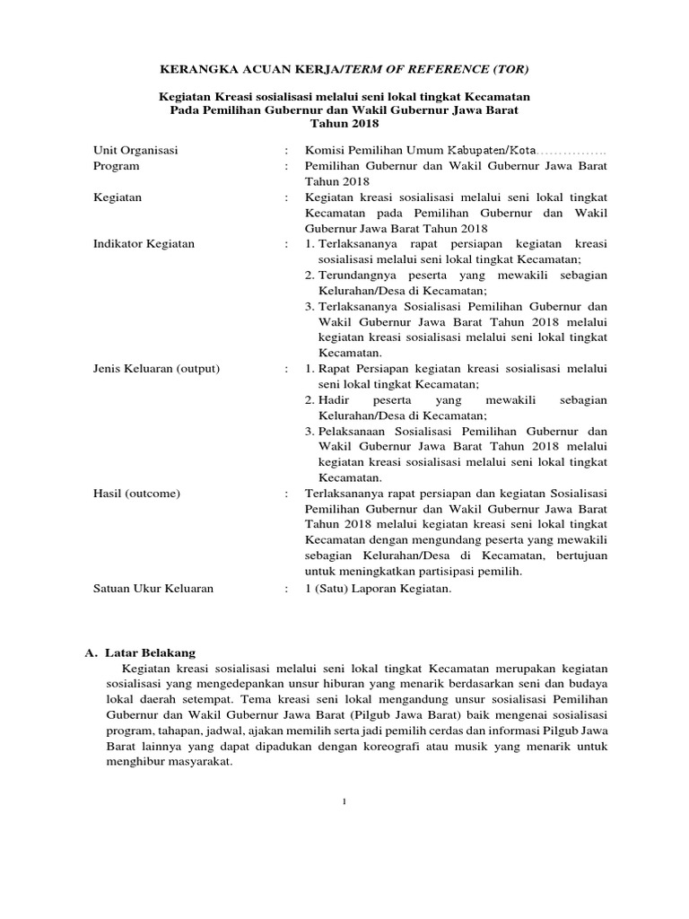 Semoga contoh kerangka acuan kegiatan tor sosialisasi pengawasan pada pemilu atau pilkada serentak ini namun mohon segala sesuatunya disesuaikan dengan kondisi dan realitas yang ada pada kegiatan di daerah masing masing. Memuat gambaran umum latar belakang suatu kegiatan strategi capaian tujuan penerima manfaat peserta waktu kegiatan dan biaya yang diperlukan. Satuan kerja perangkat aceh skpa dalam lingkup pemerintah aceh c. Kerangka acuan kerja program dan kegiatan dinas ketahanan pangan provinsi jawa tengah tahun 2018 dapat tersusun dengan baik. Maksud dan tujuan disusunnya kerangka acuan kerja ini adalah sebagai acuan dalam pelaksanaan perencanaan dan pengganggaran program dan kegiatan lingkup dinas ketahanan pangan. Ayat 2 dalam penyusunan anggaran berbasis kinerja diperlukan indikator kinerja standar biaya dan evaluasi kinerja dari setiap program dan jenis kegiatan.