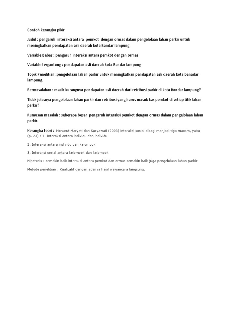 Berpikir ilmiah adalah landasan atau kerangka berpikir penelitian ilmiah. Pada contoh tersebut terdapat variabel dependen dan independen. Kerangka pemikiran dalam karya tulis ilmiah sejatinya sangat diperlukan bagi siapapun yang akan melakukan beragam jenis penelitian. Sejatinya bahkan dapat dikatakan sama saja hal hal yang membedakan barangakali dari segi istilah seta aturan dalam pembuatan karya tulis ilmiah. Kerangka proposal penelitian yang saya contohkan di sini bisa pula digunakan sebagai referensi untuk membuat proposal karya ilmiah seperti makalah skripsi tesis dan disertasi. Variabel dependen merupakan variabel yang dipengaruhi dalam hal ini adalah hasil belajar sebagai variabel yang nilainya dipengaruhi oleh variabel independen yaitu media x.