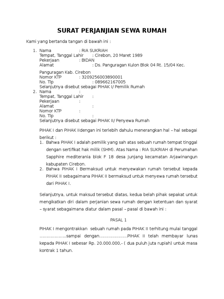 Demikianlah surat perjanjian kontrak atas rumah milik bapak arnold suwondo yang ditulis dengan sebenarnya tanpa paksaan dari pihak manapun. Selain itu alamat rumah hingga kesepakatan harga sewa rumah per tahun bulan juga tercantum termasuk jika diberlakukan uang muka dan cicilan kontrakan tiap bulannya. Contoh surat perjanjian suatu kontrak atau perjanjian adalah suatu peristiwa di mana seorang berjanji kepada orang lain atau di mana dua orang itu saling berjanji untuk melaksanakan suatu hal. Untuk makluman duti setem bagi perjanjian sewa rumah bagi setahun adalah rm1 bagi setiap rm250 untuk sewa tahunan yang melebihi rm2400. Surat perjanjian kontrak rumah adalah sebuah surat yang dibutuhkan untuk mengontrak sebuah rumah yang bisa digunakan untuk. Contoh surat perjanjian sewa rumah surat perjanjian sewa rumah sangat diperlukan demi keamanan finansial dan aset anda.