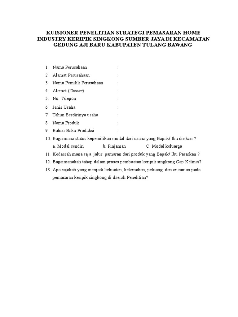 Contoh kuesioner penelitian pemasaran. Contoh kuesioner penelitian doc. Adapun contoh riset pemasaran sangat banyak ditemukan dan hampir pasti akan dilakukan oleh tiap pelaku usaha. Bauran pemasaran dan keputusan pembelian kuesioner ini disusun pada tahun 2007 dan telah sedikit dimodifikasi yaitu sebagai instrumen penelitian yang berjudul. Download contoh kuesioner penelitian. Analisis faktor faktor dalam bauran pemasaran yang berpengaruh terhadap keputusan pembelian sepeda polygon di surabaya. Contoh kuesioner penelitian doc.