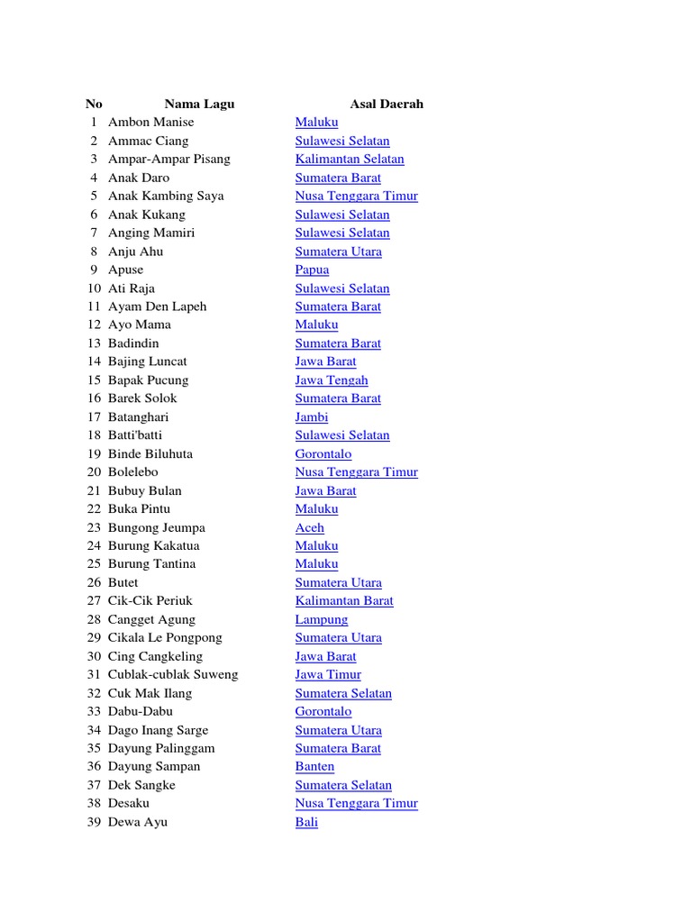 Contoh lagu daerah dan asalnya. Lagu lagu daerah di indonesia beserta daerah asalnya lagu daerah adalah lagu yang berasal dari suatu daerah tertentu dengan lirik lagu yang biasanya menggunakan bahasa daerah masing masing namun ada juga yang menggunakan bahasa indonesia sebagai lirik lagunya. Pada umumnya pencipta lagu daerah ini tidak diketahui lagi alias noname. Setiap provinsi dan daerah memiliki keunikan dan ciri khasnya masing masing membuat indonesia jadi negara yang unik karena perbedaan. Lagu daerah nusantara paling populer di masa sekarang ini adalah masa dimana grub band dengan lagu lagu yang hits mulai populer era modern eranya anak muda. Untuk lebih jelasnya berikut ini kumpulan judul lagu lagu daerah indonesia beserta asalnya dari 34 provinsi di indonesia lengkap update terbaru. 105 nama nama tarian daerah beserta gambar dan asalnya.