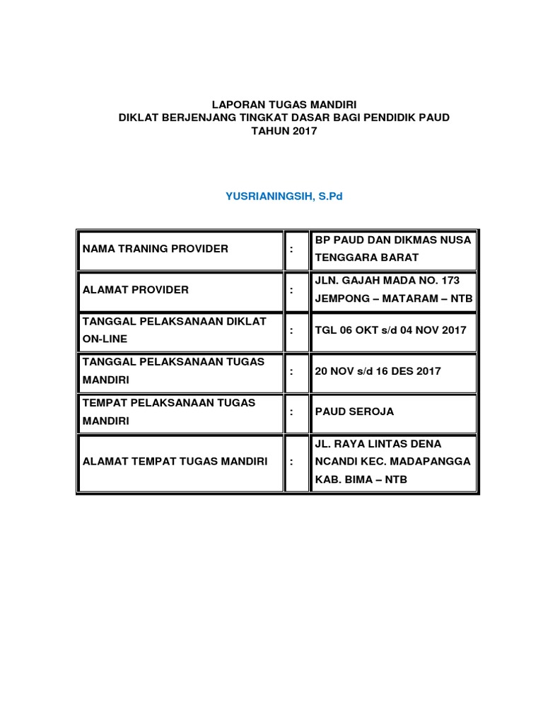 Pendidikan guru pendidikan anak usia dini. Laporan akhir tugas mandiri diklat berjenjang paud tk tingkat dasar 2014 1. Contoh lampiran tugas mandiri diklat berjenjang 5. Dengan mengucap allhamdulillah saya bersyukur kepada allah swt karena atas berkat rahmat dan anugrahnya saya dapat menyelesaikan laporan tugas mandiri diklat berjenjang tingkat dasar bagi pendidik paud. Pp paudni reg ii semarang alamat provider. 1 laporan tugas mandiri diklat.