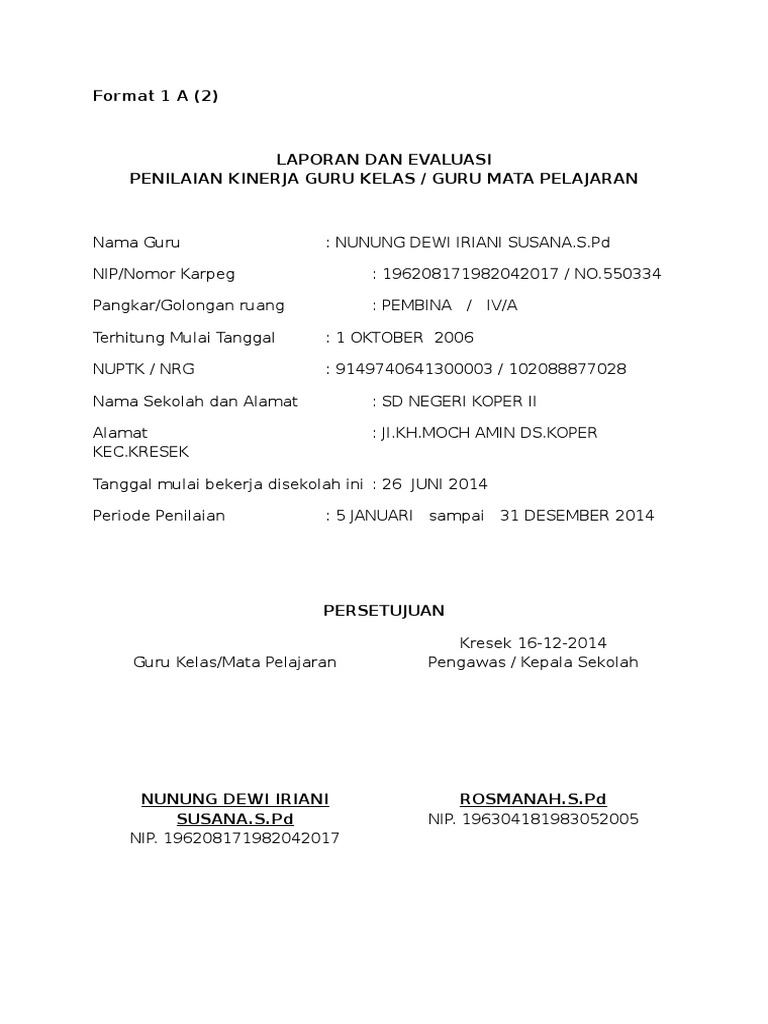 Contoh laporan dan evaluasi penilaian kinerja guru kelas guru mata pelajaran. Nilai diisi berdasarkan laporan dan evaluasi pk guru. Format evaluasi diri baca juga. Yustin susantispd nipnomor seri karpeg. Instrumen penilaian kinerja guru mata pelajaran kelas permennegpan dan rb no162009 dipersembahkan oleh. Format catatan dan evaluasi penilaian kinerja per kompetensi digunakan untuk mencatat semua hasil pengamatan dan pemantauan yang telah dilakukan sebagai bukti pelaksanaan penilaian kinerja guru. Catatan ini harus dilengkapi dengan bukti bukti fisik tertentu misalnya dokumen pembelajaran dan penilaian alat peraga dan media pembelajaran atau dokumen lain yang menguatkan bukti kinerja guru.