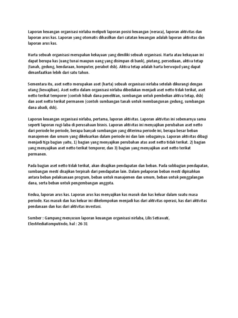 Hal ini bagi sebagian organisasi nirlaba yang scope nya masih kecil serta sumber daya nya masih belum memadai mungkin akan menjadi hal yang menantang untuk dilakukanterlebih karena organisasi nirlaba jenis ini umumnya lebih fokus pada pelaksanaan program ketimbang mengurusi administrasi. Laporan posisi keuangan neraca. Laporan posisi keuangan neraca pada akhir periode laporan. Kas dan setara kas rp xxx rp xxx. Aktiva terikat untuk investasi dalam tanah. Menurut psak 45 organisasi nirlaba perlu menyusun setidaknya 4 jenis laporan keuangan sebagai berikut.